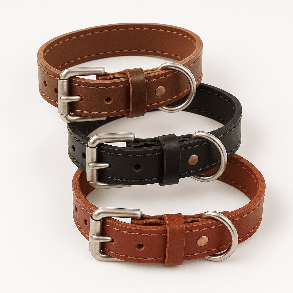 Collares de cuero disponibles en tamaños del Nº 1 al Nº 5, ideales para perros pequeños, medianos y grandes. Diseñados para combinar estilo y durabilidad.